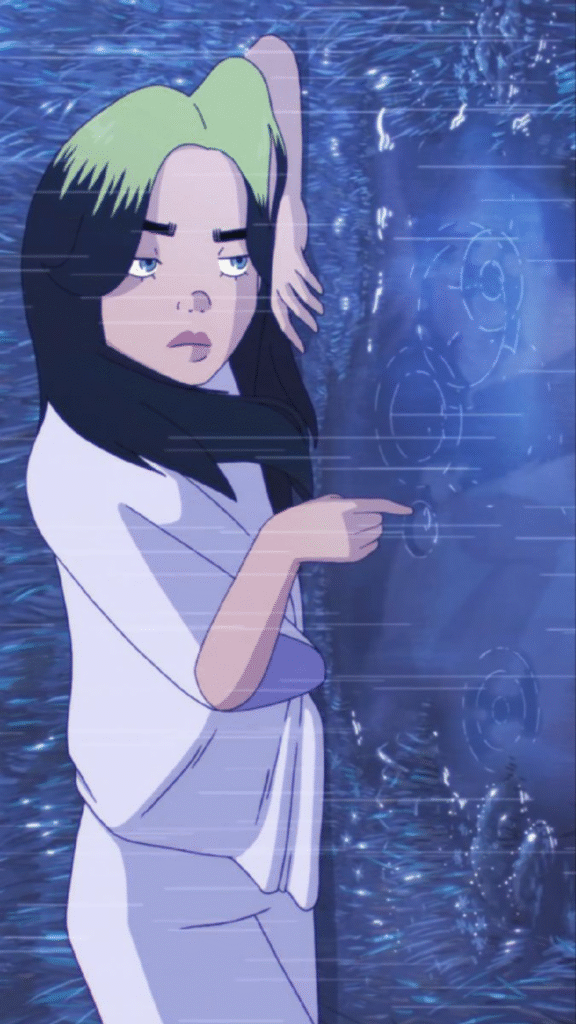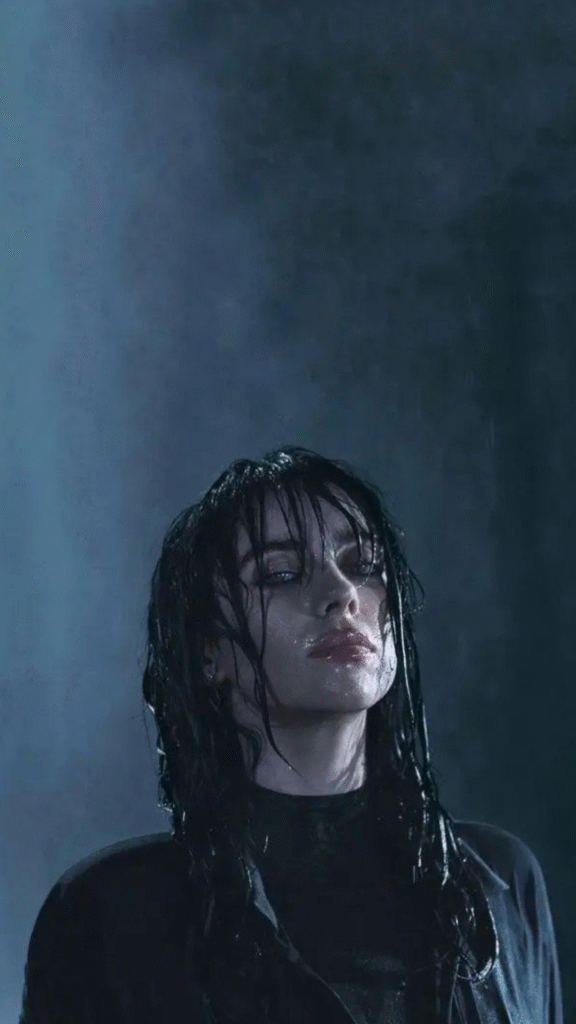 L’image est devenue iconique : Billie assise, immobile, le regard fixe, pendant que des larmes noires coulent de ses yeux. On pourrait croire à un effet esthétique, mais il y a autre chose : une volonté de rendre visible la douleur. Ces larmes épaisses, presque huileuses, ne disent pas “je pleure” mais “je déborde”.